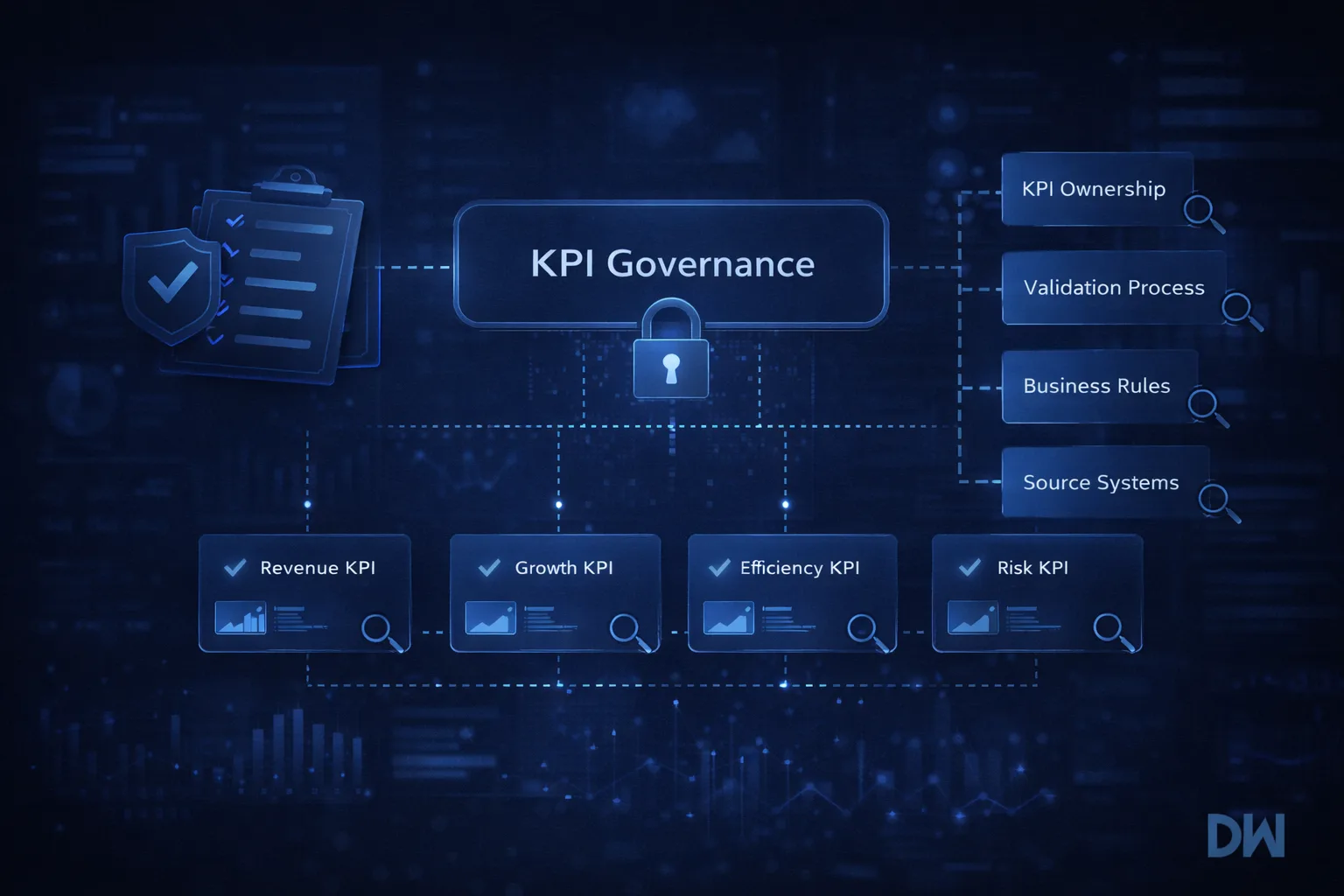 Structured governance frameworks ensure that every KPI, report, and dashboard element can be traced back to: