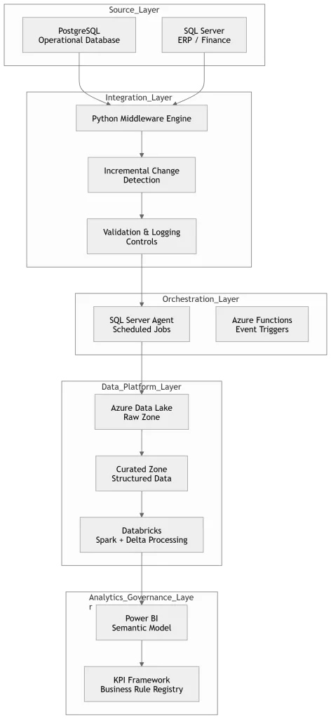 A mid-sized industrial organization operated multiple operational and financial systems across separate PostgreSQL and Microsoft SQL Server environments.
