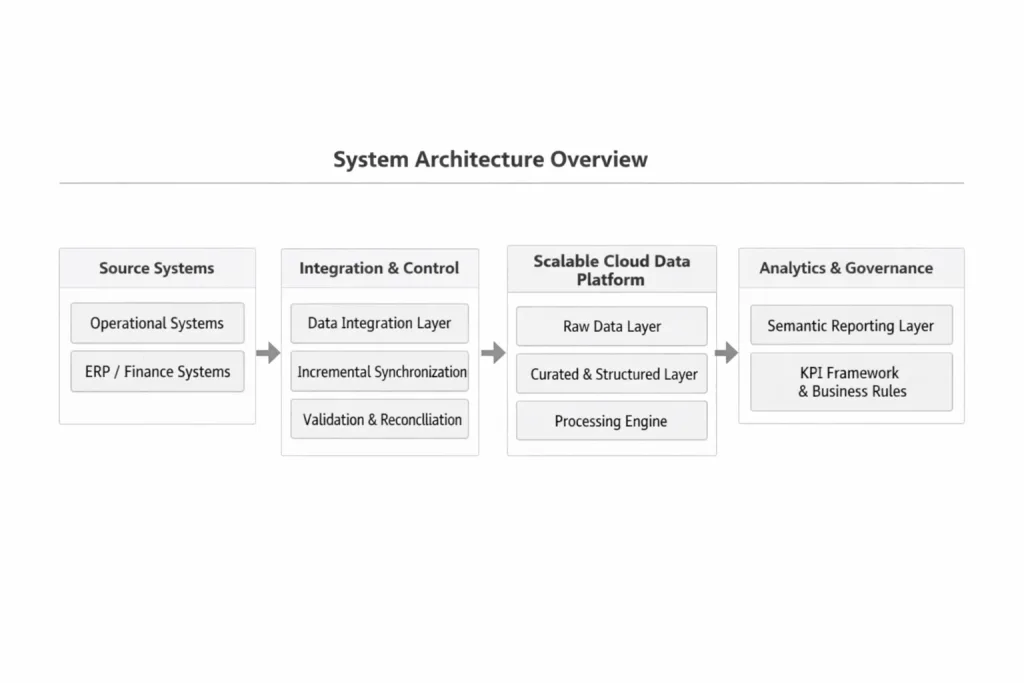 Production data, ERP data, and reporting systems were maintained independently. Over time, reporting logic diverged between departments, KPI definitions lacked formal documentation, and manual reconciliation became part of the monthly reporting cycle.